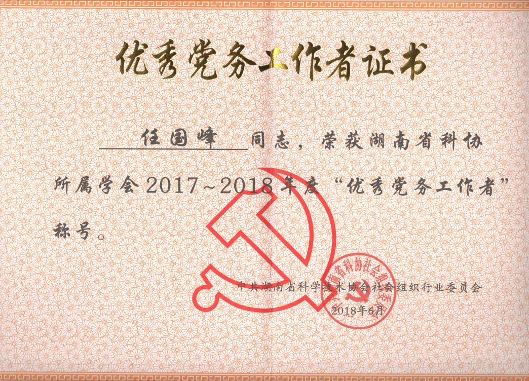任国峰老师被授予2017~2018年度“优秀党务工作者”荣誉称号。任国峰老师2014年起担任中共湖南省营养学会党支部书记后,建立和不断完善各项组织制度,抓牢抓实党建工作责任,带领全支部党员不断夯实支部工作,荣获中共湖南省科协社会组织行业委员会授予的“2016年度先进党支部”。任国峰老师讲党性重品行,威信较高,自觉遵守党的纪律,模范履行党员义务,带头贯彻执行党的路线方针政策,自觉践行社会主义荣辱观,发扬社会主义新风尚。