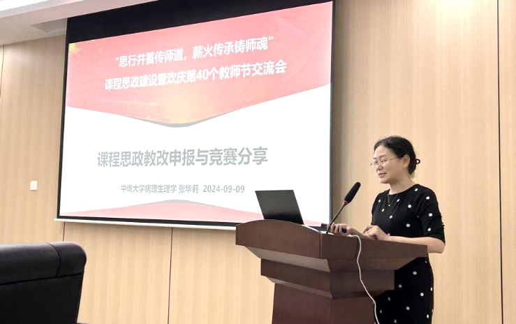 教师教学发展中心,联合举办以“思行并蓄传师道,薪火传承铸师魂”为主题的课程思政建设暨欢庆第40个教师节交流会。活动特别邀请到基础医学院张华莉教授开展题为“课程思政教改申报与竞赛分享”的讲座。学院党委书记雷先阳、院长胡国清、副院长李杏莉、秦家碧,以及30余位教师出席会议,本次会议由李杏莉主持。
