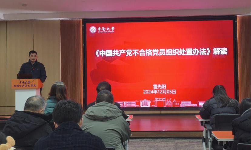 会上,雷先阳为学院全体党员详细讲解《中国共产党不合格党员组织处置办法》,从主要内容、组织处置的概念、组织处置的适用情形、组织处置的原则、组织处置的程序、教育管理、申述及其处理等九个方面,强调了处置不合格党员对纯洁党员队伍、净化政治生态和凝聚组织力量的重要性。