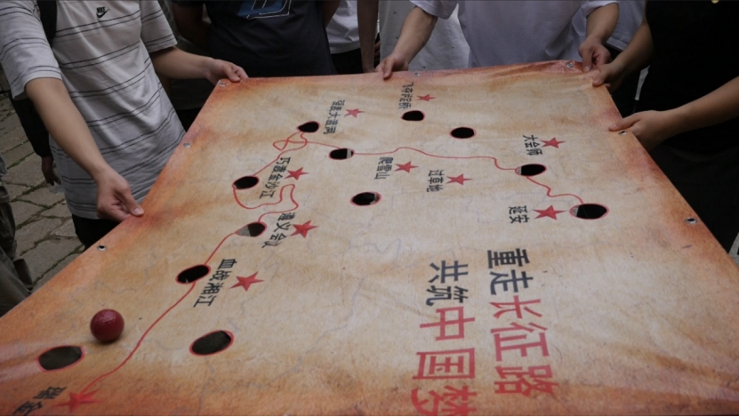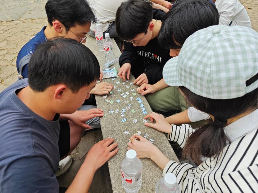 之后,全体党员以组为单位,按照“东方红广场—登高路—岳麓书院—爱晚亭—道中庸亭遗址—极高明亭遗址—黄兴墓—观光长廊”路线开始登山。在爱晚亭下,四组党员争分夺秒,用最快的速度完成了爱晚亭等长沙风景名胜主题拼图,体现出良好的团队协作精神。党员们还齐心协力操控小球通过长征路线地图,完成“重走长征路”活动。在登山过程中,两个支部的党员们亲切交流,互相帮助,并通过游戏环节逐渐加深了对彼此的了解,有效促进了支部间的互动交流。