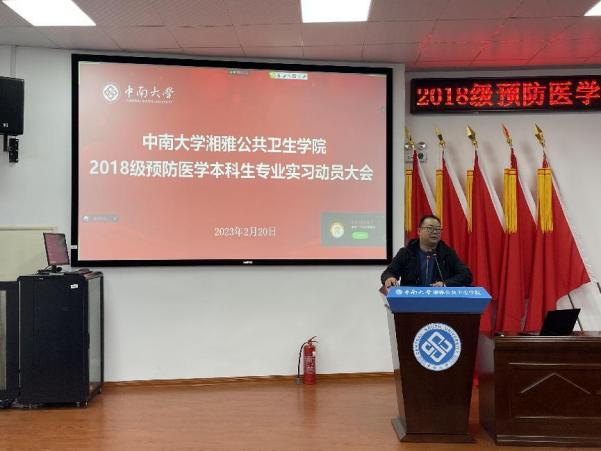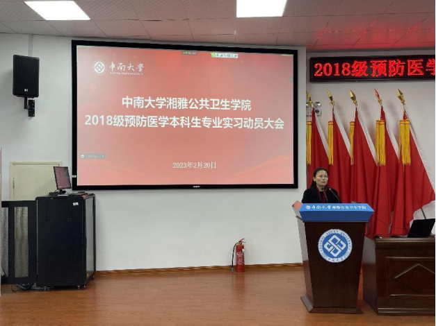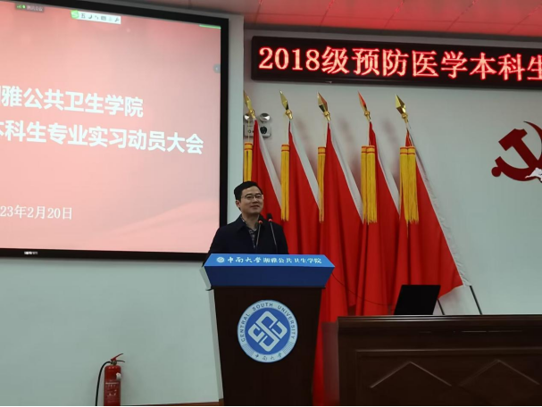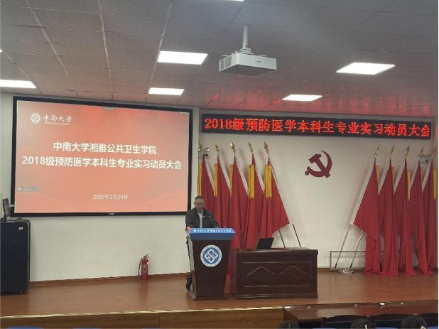 专业实习是预防医学人才培养过程中的重要环节,也是学生从学校踏入社会的过渡阶段为做好2018级预防医学本科生的专业实习工作,加强专业实习教学过程管理,保证专业实习教学质量,2023年2月20日上午10:002018级预防医学专业实习动员大会在学院学术报告厅顺利召开。学院党委书记雷先阳副书记唐媛副院长李杏莉、学院业务办和学工办负责老师出席大会,预防医学2018级全体本科生参加会议,会议由本科生辅导员肖铂洋主持。