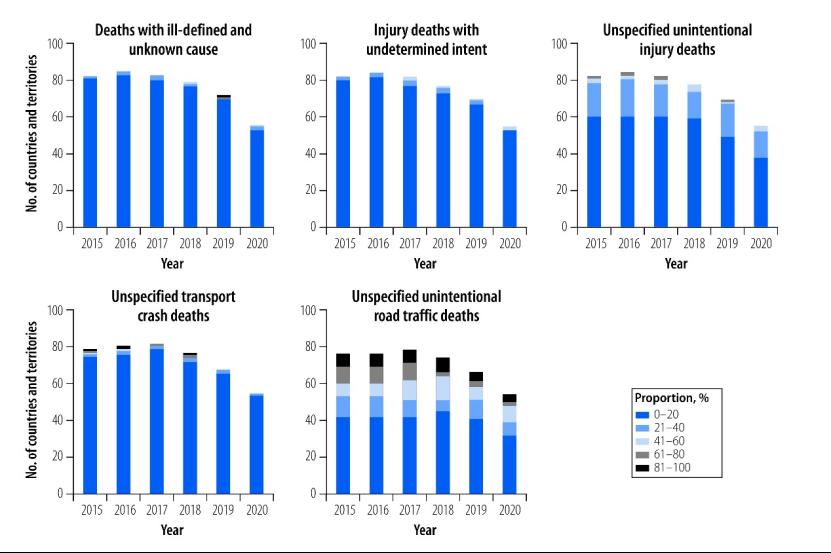 对于世界卫生组织死亡率数据库包括的道路交通伤害死亡数据,其编码质量并不理想,未特指的非故意伤害、未特指的非故意道路交通伤害两类问题编码使用较为普遍。97个使用4位ICD-10编码系统报告死因的国家和地区中,平均每年报告未特指的非故意伤害死亡达20%以上的国家有21个,报告未特指的非故意道路交通伤害死亡达20%以上的国家有30个。
