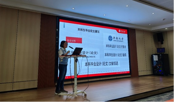 随后,邓静副教授和李敏主任分别从毕业设计的内容和工作要求上做了介绍。邓静副教授从选题相关建议、任务书撰写规范、论文翻译和文献综述相关要求等方面对毕业设计的一些细节问题进行了梳理。她还强调,毕业论文的撰写须严格遵守学术道德规范,禁止抄袭、伪造数据、请人代写等学术不端行为。李敏主任向同学们介绍了毕业设计的具体任务和时间安排,强调毕业设计全过程一定要在老师的指导下进行,提高工作效率,保障毕业设计质量。