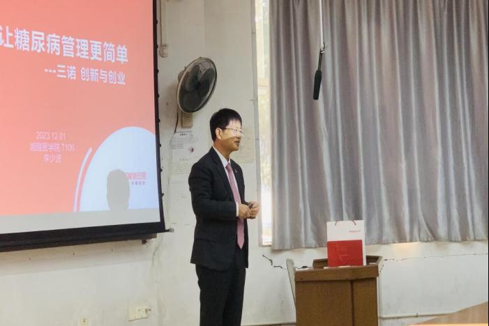 客座教授、2009年湖南省创业标兵、Sinocare三诺生物董事长兼总经理李少波为同学们讲授《创新创业导论》的案例课——三诺生物创业实践,为同学们传授创业经验,助力同学们在毕业的岔路口上找准方向,为同学们实现自我价值和社会价值提供新的思考。