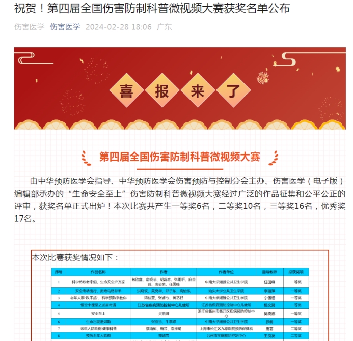 本次科普微视频大赛获奖团队来自流行病与卫生统计学、劳动卫生与环境卫生学、营养与食品卫生学、儿少卫生与妇幼保健学、卫生毒理学等学科研究方向。获奖科普短视频将在中华预防医学会伤害预防与控制分会、伤害医学(电子版)编辑部平台向全社会推广科普。今日看料