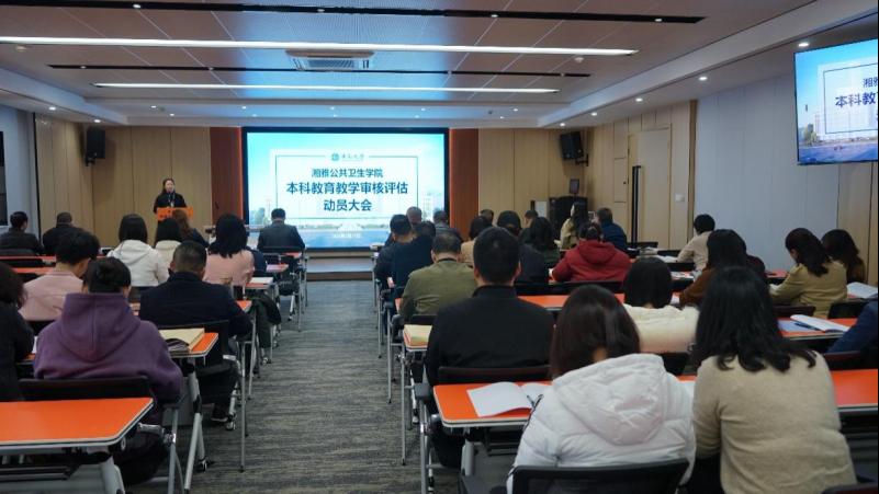 在公卫楼学术报告厅召开新一轮本科教育教学审核评估动员大会,全体院领导,各系(中心)全体教师、学院各办公室全体成员参加会议。会议由院长胡国清主持。