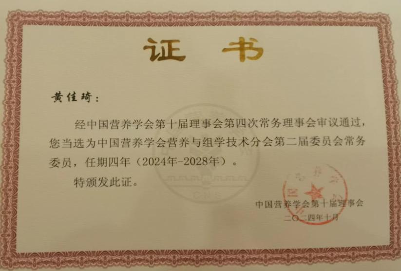 三诺营养与代谢健康研究中心执行主任黄佳琦教授凭借其卓越的学术成就和深厚的专业素养,入选中国营养学会营养与组学技术分会常务委员。黄佳琦教授长期以来致力于推动营养与组学技术的交叉融合与创新发展,取得了丰硕的学术成果,并强调组学技术在营养学研究中的重要性。