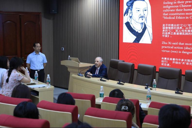 名誉教授的决定,湘雅医学院常务副院长武明花为Arthur Kleinman教授颁发了名誉教授聘书并佩戴校徽。湘雅医学院常务副院长武明花致辞时表示,Arthur Kleinman教授数次到访湘雅,搭建了湘雅医学院与哈佛医学院的学术桥梁,如今凯博文教授再次来到湘雅,担任今日看料