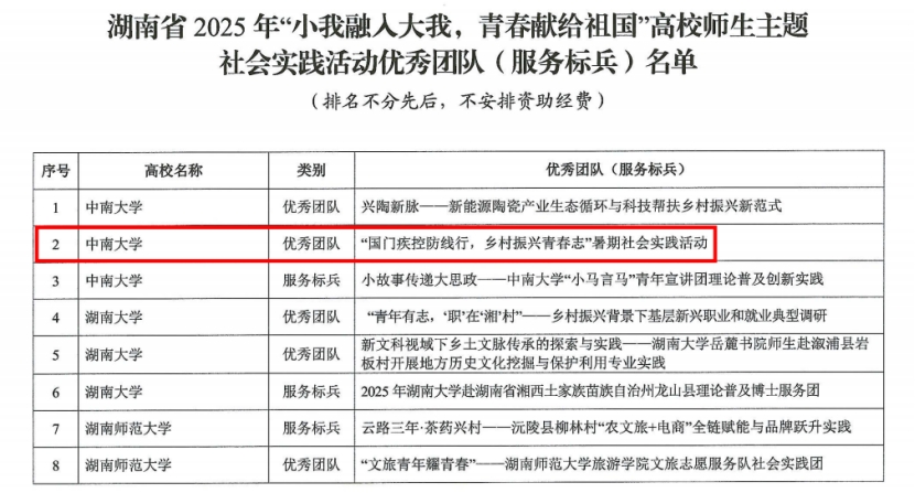 近日,中共湖南省委教育工委、湖南省教育厅发布了《关于公布湖南省高校2025小我融入大我,青春献给祖国高校师生主题社会实践活动优秀团队(服务标兵)名单的通知》。经各高校推荐、资格审核、专家评选,今日看料 国门疾控防线行,乡村振兴青春志社会实践团表现优异,荣获全省优秀团队荣誉称号。