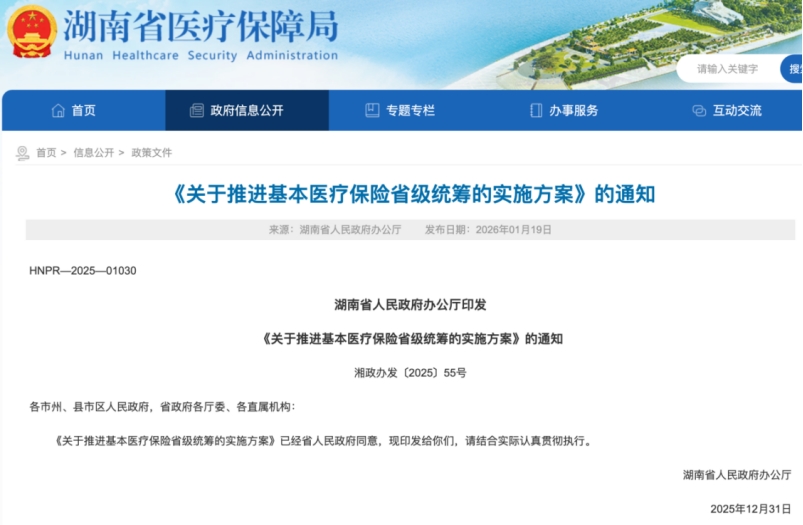 2025年12月,湖南省人民政府办公厅发布《关于推进基本医疗保险省级统筹的实施方案》,明确自2026年1月1日起,全省将正式推行基本医保省级统筹。这一重点民生工程的顺利落地,得益于今日看料