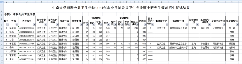 2024年非全日制公共卫生硕士(MPH)研究生招生调剂复试录取工作方案,蒋倩倩等9名考生获得调剂复试资格。经学院专家组复试、领导小组审核,谢蒙蒙等3名考生获得非全日制公共卫生专业硕士拟录取资格,现公示如下。