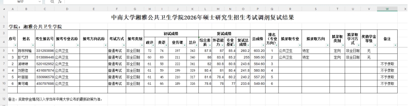 2026年非全日制公共卫生硕士(MPH)研究生招生调剂复试录取工作方案,陈林梓榆等6名考生获得调剂复试资格。经学院专家组复试、领导小组审核,陈林梓榆等2名考生获得非全日制公共卫生专业硕士拟录取资格,现公示如下。