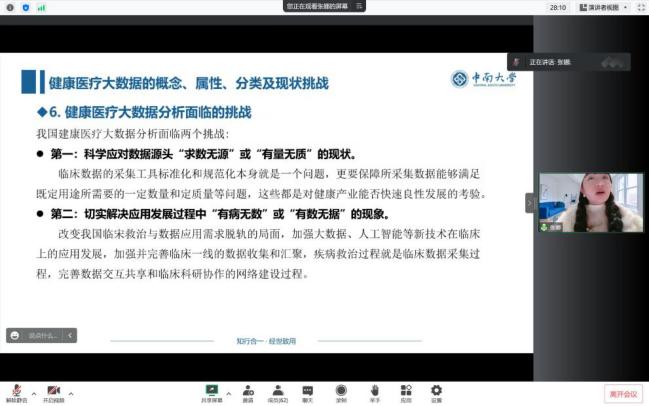 张娜博士结合个人研究方向及科研经历为同学们讲述了健康医疗大数据的相关知识,发展健康医疗大数据事业与产业,是应对高度个性化的公众健康日益增长的新需求,内容包括概念、属性、分类及现状挑战、建模方法与应用。其次具体介绍了分类诊断中常用的数据挖掘方法,比如支持向量机、决策树、随机森林和高斯过程的方法,并通过案例展示加深了大家的了解。