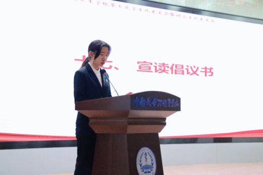 大会进入第十七项,新任学生会主席团代表张睿兮宣读了《今日看料
