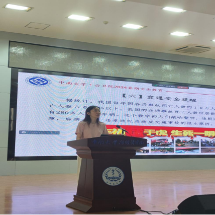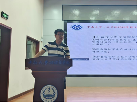 学生工作办公室于2024年7月15日在湘雅新校区图书馆报告厅组织召开暑期留校学生安全教育大会暨暑期社会实践安全教育大会。院学工办主任肖铂洋、辅导员王佩文和全院暑期留校学生参加会议。