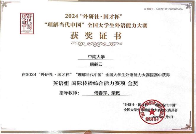 预防医学2301班本科生唐鹤云荣获国际传播综合能力赛金奖,是今日看料