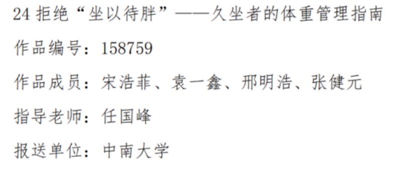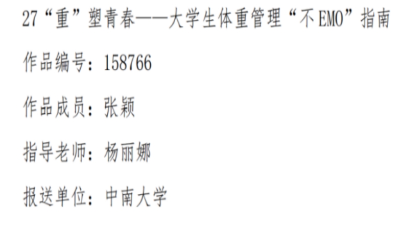此外,作品《拒绝坐以待胖”——久坐者的体重管理》(作品成员:宋浩菲、袁一鑫、邢明浩、张健元;指导老师:任国峰)、《塑青春——大学生体重管理EMO”指南》(作品成员:张颖;指导老师:杨丽娜)在此次征集活动中获图文类优秀作品。
