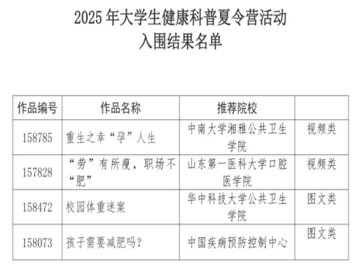 作品《重生之幸人生》(作品成员:刘文君、柳阳灵、韩远莉、欧婧;指导老师:林茜)获得视频类优秀作品,并成功入围2025年大学生健康科普夏令营活动(仅4支团队入围)。