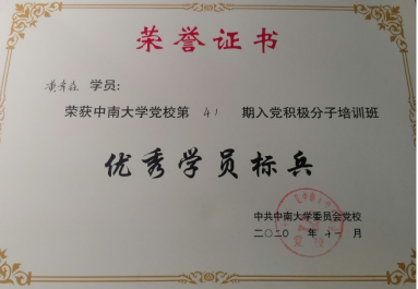 (图为预防1902班黄幸垚同学获评优秀学员标兵)